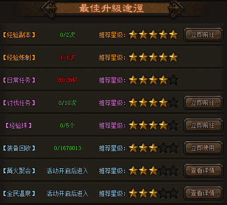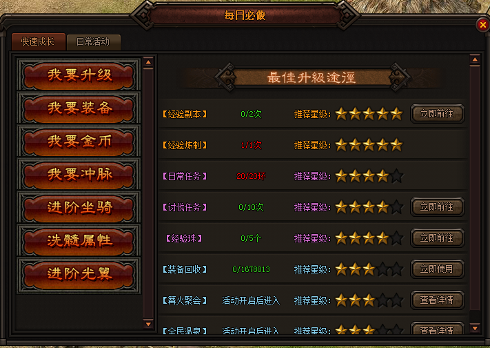 通过切换右侧的页签查看如何升级、冲脉、洗髓、如何获得金币、装备、如何给坐骑和光翼进阶。