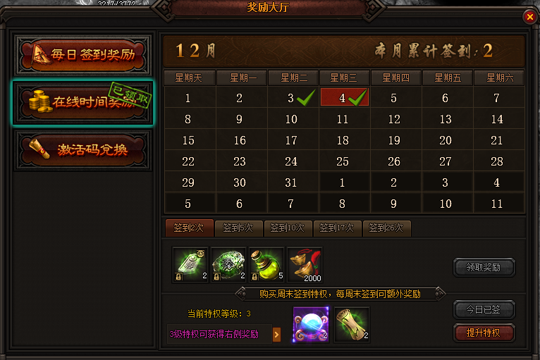 P.S:VIP用户上线系统自动替您签到、收礼,是不是很方便,再也不用担心忘记啦,快来体验吧,点击签到界面【提升特权】按钮即可升级VIP~