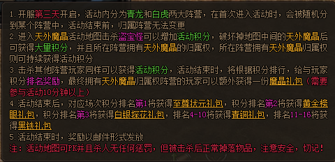 玩家会被随机分到青龙和白虎两个阵营,以争夺魔晶的控制权和击杀魔晶为目标,积分排名靠前或胜利的阵营都可获得奖励。