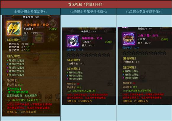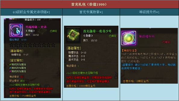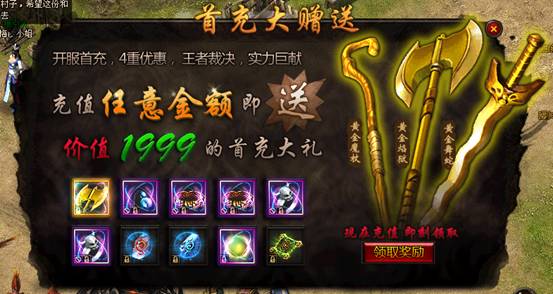 【活动内容】从开服当日起,只要您是第一次在该服务器充值任意金额,除了能得到相应的元宝之外,还将额外获赠一份价值1999的首充礼包。