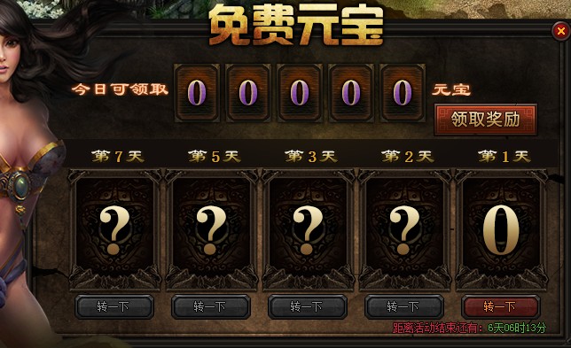 活动内容:玩家在新区创建角色后7天内,特定天数在免费元宝界面转动相应位置数字,即可免费领取相应数量的元宝,领取数量由你决定,只要人品够给力,第七天最高可以一次领取99999元宝。小伙伴们带上人品赶紧行动起来吧。
