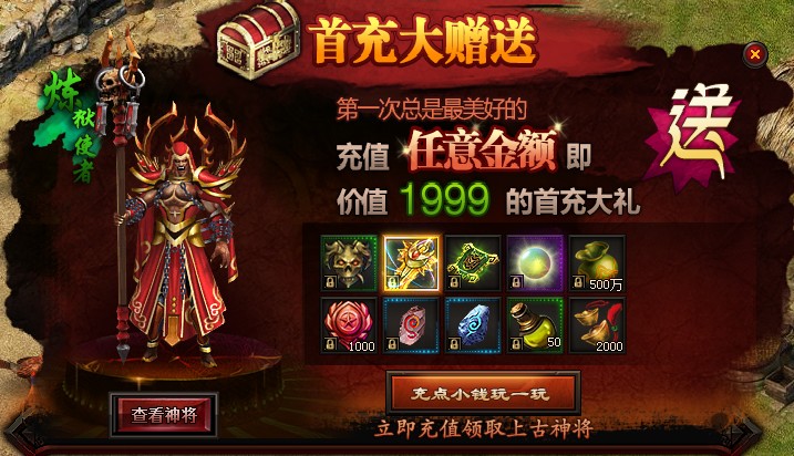 活动奖励: 紫色神将·炼狱使者、对应职业极品武器*1、首充勋章--传奇少年*1、等级提升丹*1(使用后等级可直接提升一级)、金币*500万、功勋值*1000(可用于寻宝兑换高级套装、特戒宝盒等)、气血石(大)*1、魔血石(大)*1、祝福油*50、绑定元宝*2000