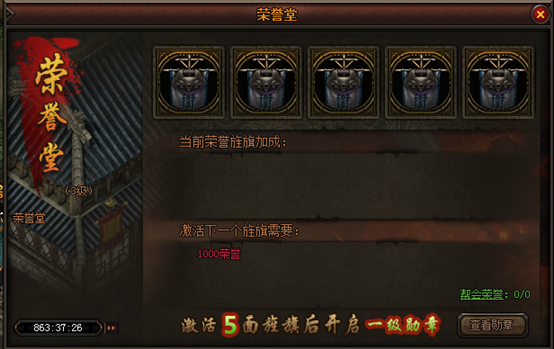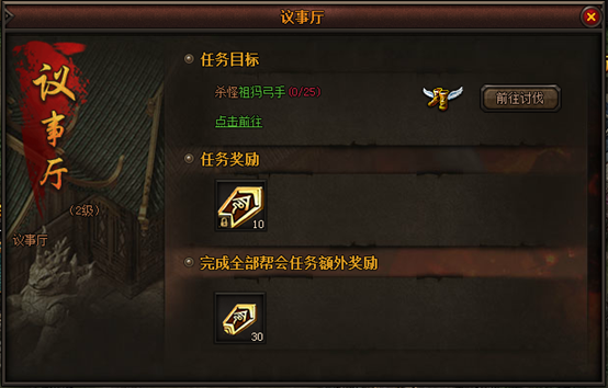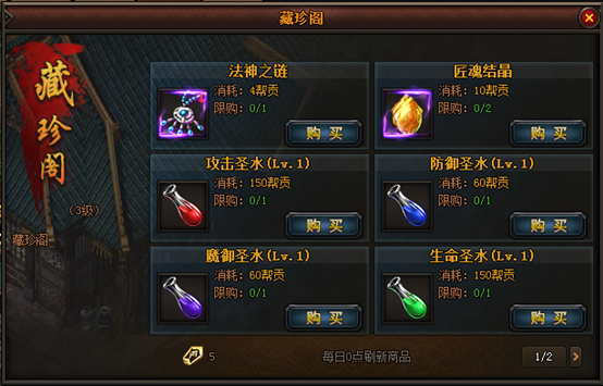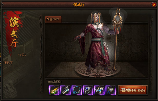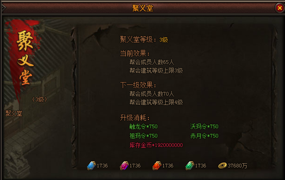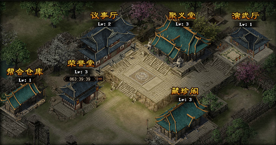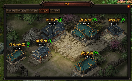 聚义堂:帮会主建筑,决定了帮会等级、帮会成员上限与帮会其他建筑的等级上限; 议事厅:接取帮会任务的场所,完成帮会任务获得帮贡奖励; 荣誉堂:升级聚义堂的帮会旗帜与个人勋章,可以为玩家提供一定的属性加成;帮会荣誉与个人战功可在沙城战、领地战与帮会宣战中获得 藏珍阁:帮会商店,根据藏珍阁的等级可以消耗帮贡购买特有的进阶材料、装备与属性药品; 演武厅:帮会BOSS与领地BOSS召唤,击杀BOSS获得帮贡与掉落奖励; 帮会仓库:升级后,可增加仓库格子 1.2 建筑升级