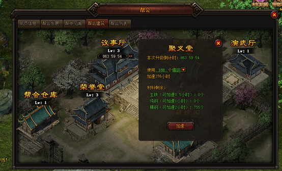 帮会成员可使用材料对帮会建筑的升级进行加速,加速材料可通过击杀帮会BOSS获得 1.1 帮会包含6个建筑