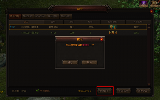 帮会3天内有登录的成员均可参与投票,弹劾帮主,若选择弹劾帮主的人数超过活跃人数的1/2,则弹劾成功,帮主下野。