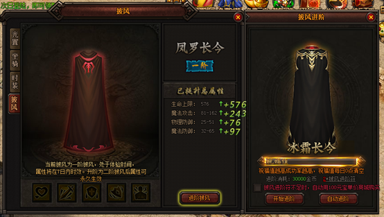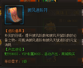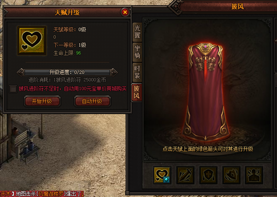 可以使用披风进阶符对披风进行升阶; 披风进阶可以获得披风天赋:生命、攻击、物防、魔防、暴抗 使用披风进阶符对天赋技能进行升阶; 点击“进阶”箭头按钮,打开天赋技能进阶界面: