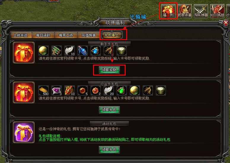 进入游戏—【福利】—【礼包奉上】—【新手卡礼包】。点击领取奖励按键输入新手卡卡号即可获得。